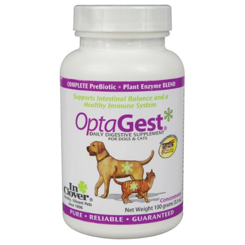 Diet change, age, or stressful situations reduce digestive efficiency resulting in diarrhea and gas. OptaGest is a complete, natural digestive formula of four plant enzymes, plus prebiotic, to assure proper digestion and absorption of nutrients throughout the entire digestive system. Clinically-tested levels of the prebiotic FOS feed the naturally-occurring bacteria that replenish essential enzymes. OptaGest contains NO fillers, sugar, or preservatives. Slightly sweet powder that pets enjoy. NASC quality seal and 100% guaranteed. Directions: Pets 20 lbs & under...1/4 tsp, Pets 21-40 lbs...1/2 tsp, Pets 41-65 lbs...3/4 tsp, Pets 66-80 lbs...1 tsp, Pets 81-100 lbs...1 1/4 tsp, Pets 101 lb and over...1 1/2 tsp. Double amounts for mature pets.