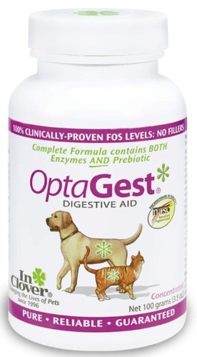 Opta Gest Digestive Aid by In Clover is a complete all-natural supplement for digestive health in dogs.Signs of poor digestive health in cats and dogs Bad breath Gas Increased stool Diarrhea Excessive shedding, itching or allergic reactions HairballsDigestive enzymes are easily destroyed by the normal processing of commercial pet food. External conditions such as travel, separation, storms, diet change, etc., can cause anxiety or stress that may reduce digestive efficiency. Also, as the body ages, fewer enzymes are produced. OptaGest replenishes the enzymes that help process fats, carbohydrates and protein, easing the burden placed on the digestive system. The prebiotic, FOS, feeds the native bacteria that naturally replenish these essential enzymes.