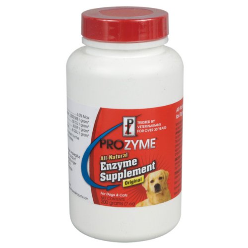 Prozyme Enzyme Supplement is a unique, all natural, high potency, plant-derived enzyme supplement that will unlock the nutrients contained in your pet's food. Prozyme is scientifically proven to increase the absorption of essential nutrients and fatty acids. The enhanced bioavailability and superior assimilation of the vitamins, minerals, essential fatty acids, and other nutrients as a result of adding Prozyme to the food, is beneficial for pets of all ages, especially older ones; particularly those experiencing problems which benefit from increased nutritional absorption including: Directions: Add 1/4 teaspoon for every cup of food. A 200 gram jar treats 160 cups.